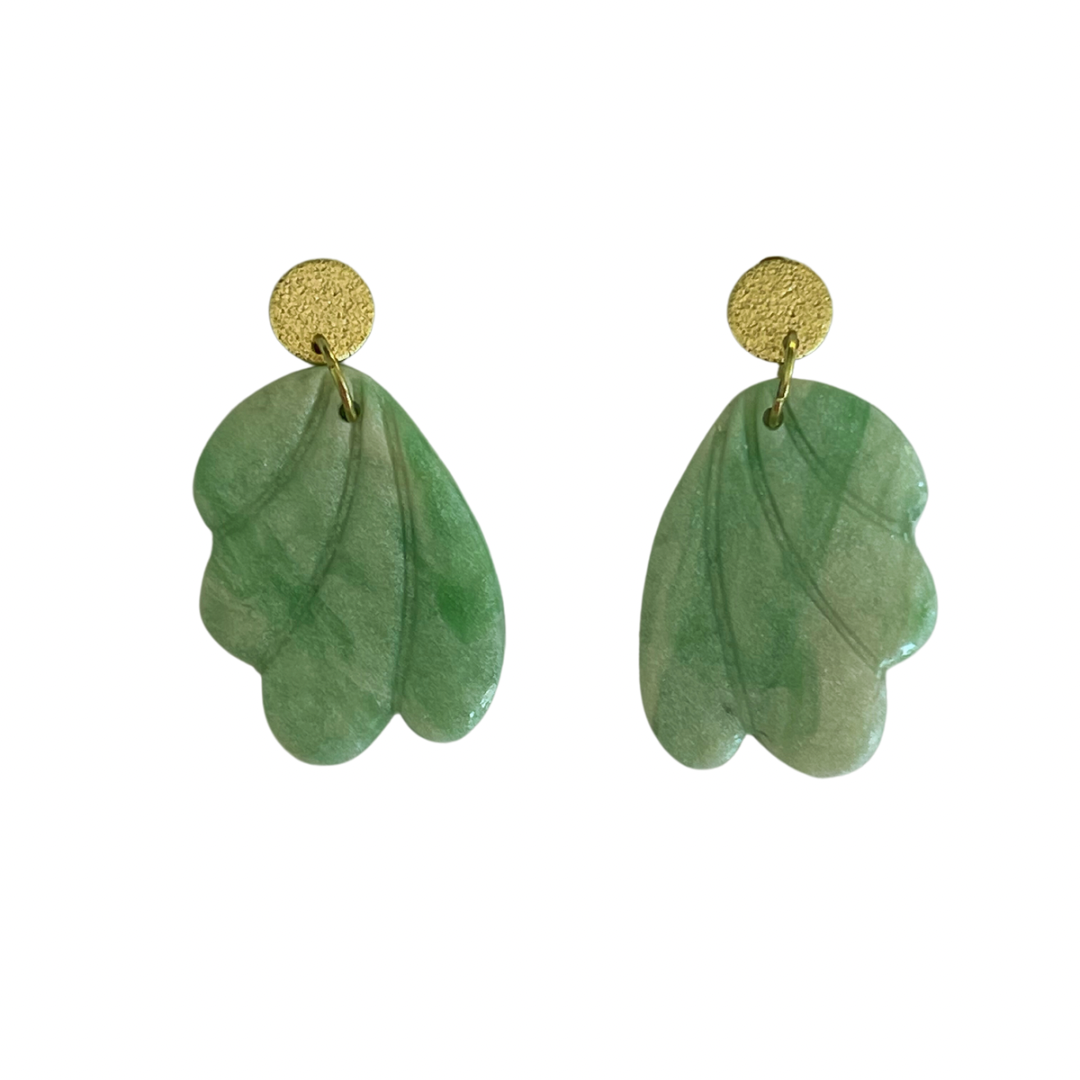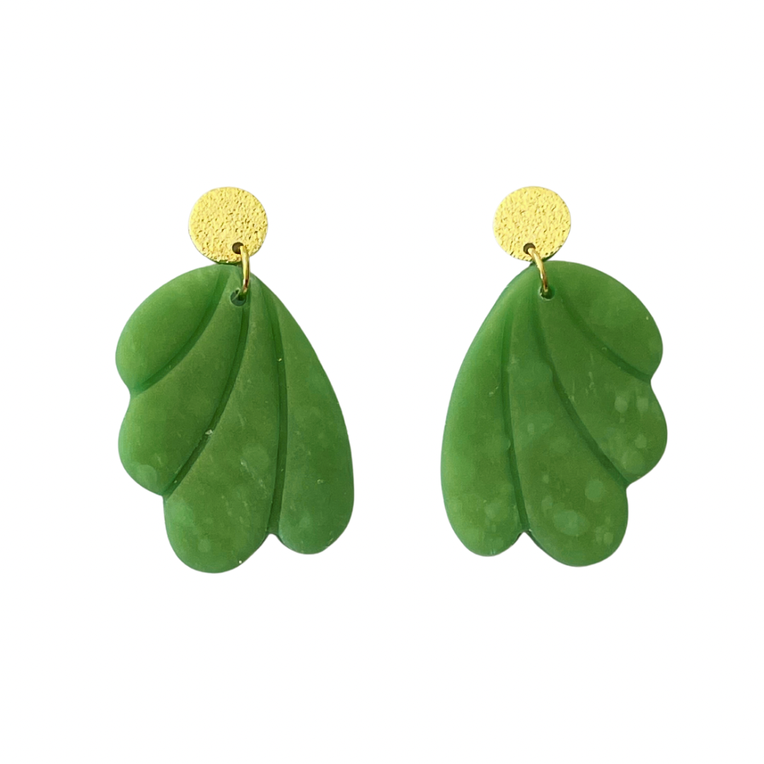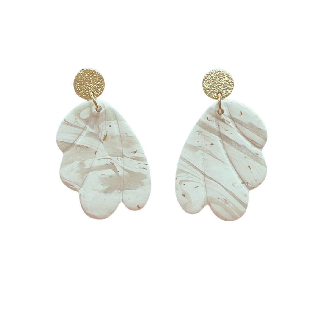 Hand-stamped scalloped polymer clay charms affixed to shimmery gold disc posts.