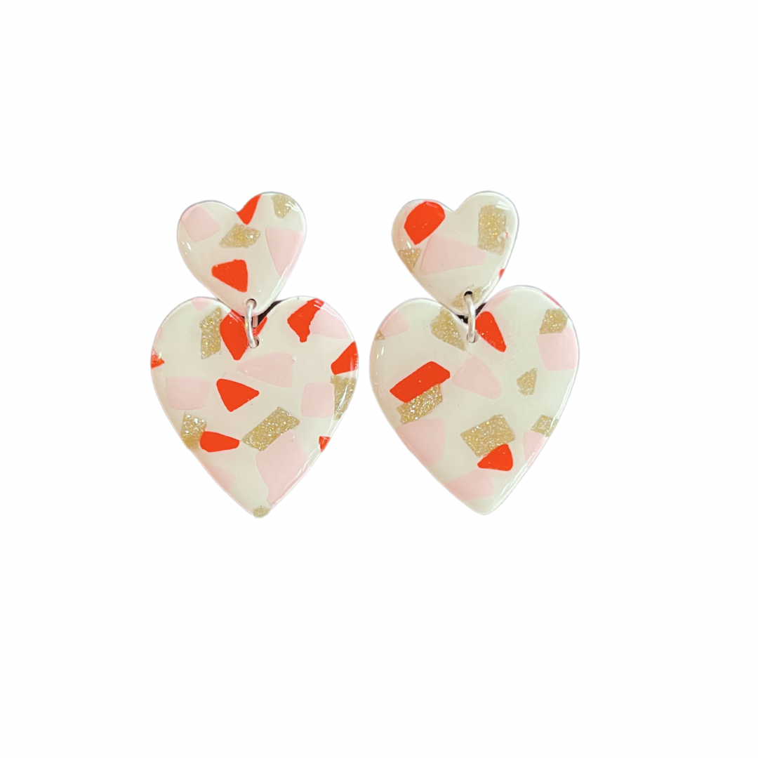 Hand-stamped polymer clay heart charms suspended from polymer clay heart studs affixed to surgical steel posts.